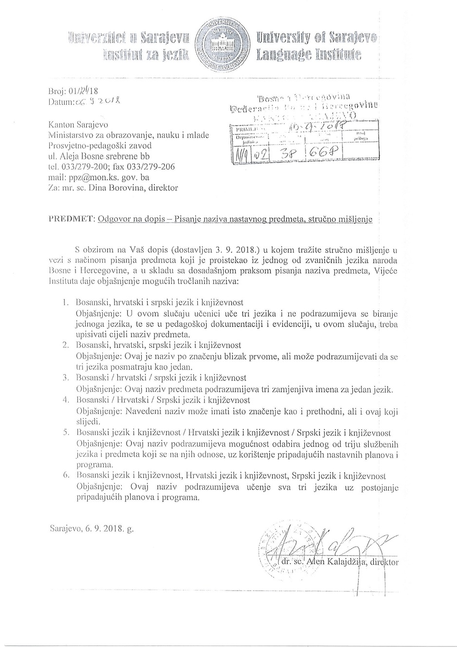 Naime, uslijed javnosti već poznatih okolnosti oko nedoumica kod mogućih rješenja u pisanju naziva nastavnog predmeta za maternji jezik i književnost u Kantonu Sarajevo, tačno je da je Institut 6. 9. 2018. poslao svoje stručno mišljenje u vezi s tim, a koje je prethodno usaglašeno među svim kolegama na Vijeću Instituta za jezik.