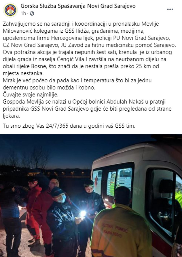 "Ova potražna akcija je trajala nepunih šest sati, krenula je iz urbanog dijela grada iz naselja Čengić Vila i završila na neurbanom dijelu na obali rijeke Bosne, što znači da je nestala prešla više 25 kilometara od mjesta nestanka. Mrak je već počeo da pada kao i temperatura, što bi za jednu dementnu osobu možda bilo i kobno. Čuvajte svoje najmilije", kazali su iz Gorske službe spašavanja.