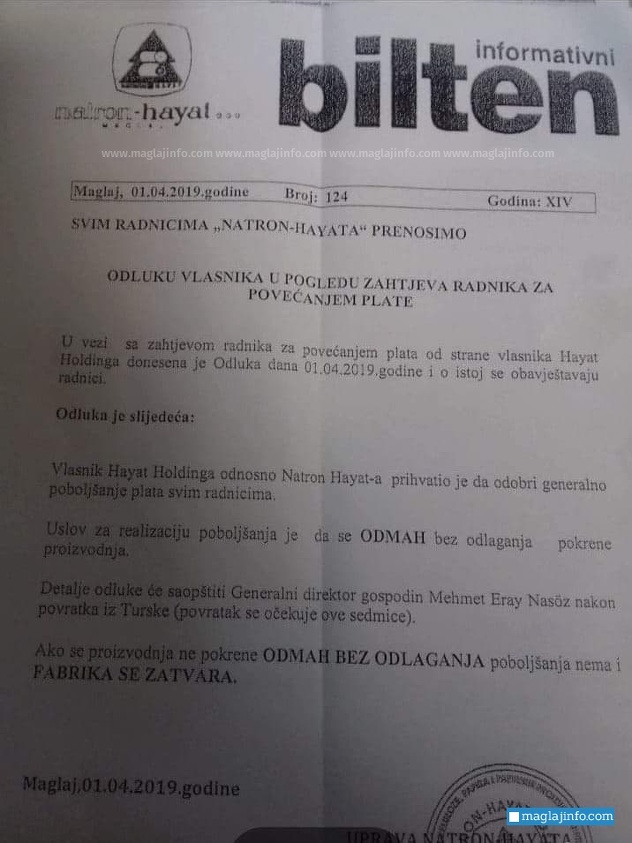 Na kapiji kompanije portir nam je prenio informaciju iz uprave preduzeća da se u narednim danima u Maglaju očekuje dolazak generalnog direktora iz Turske te da će više informacija biti poznato o svim dešavanjima u ovom preduzeću u proteklih nekoliko dana.
