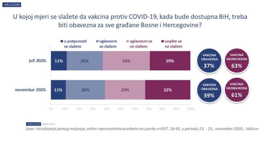 Tako, kada je u pitanju sama vakcina protiv COVID-19 te hoće li ona biti obavezna za sve građane u Bosni i Hercegovini, ako bi se pitali građani BiH, njih skoro dvije trećine (61%) smatra da vakcinisanje ne bi trebalo biti obavezno, dok nešto više od trećine (39%) podržava obaveznu vakcinaciju protiv COVID-19.