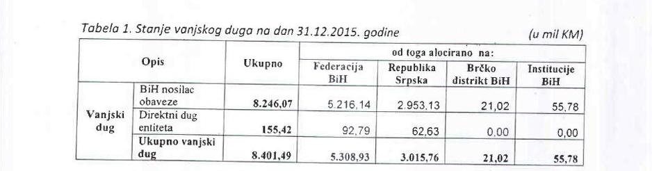 Iz ovih podataka proizilazi da stanje javne zaduženosti Bosne i Hercegovine iznosi 11,73 milijarde KM. Nekoliko mjeseci ranije, tačnije u oktobru 2015. godine ministar finansija i trezora BiH Vjekoslav Bevanda kazao je da stanje javne zaduženosti Bosne i Hercegovine iznosi 11,69 milijardi KM.