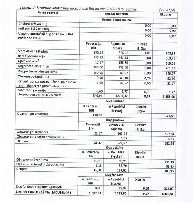 Prema podacima kojima raspolaže Ministarstvo finansija i trezora Bosne i Hercegovine, unutrašnja zaduženost na dan 30. septembar 2015. godine iznosila je 3,3 milijarde KM.