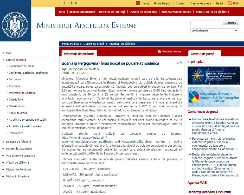 Ministarstvo vanjskih poslova obavještava rumunske državljane koji namjeravaju putovati u Bosnu i Hercegovinu kako je, prema podacima koje su prenijele lokalne vlasti, atmosfersko zagađenje na vrlo visokom nivou.