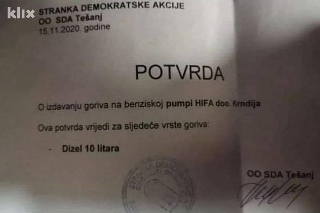 "Posebno radikalan slučaj kupovine glasova birača na dan izbora zabilježen je Tešnju gdje Stranka demokratske akcije (SDA), kako su istakli, vrši podjelu potvrda o izdavanju 10 litara dizel goriva na benzinskoj pumpi Hifa d.o.o. Krndija", navode iz ove koalicije