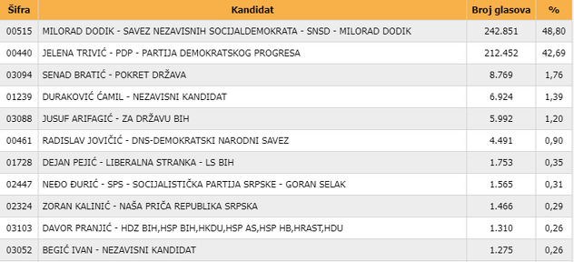 Kako je saopćeno iz Centralne izborne komisije, Senad Bratić je trenutno u vodstvu za potpredsjednika RS-a s 1,76 posto glasova. Na drugom mjestu nalazi se Ćamil Duraković s 1,39 posto glasova, dok je Jusuf Arifagić za sada osvojio 1,20 posto.