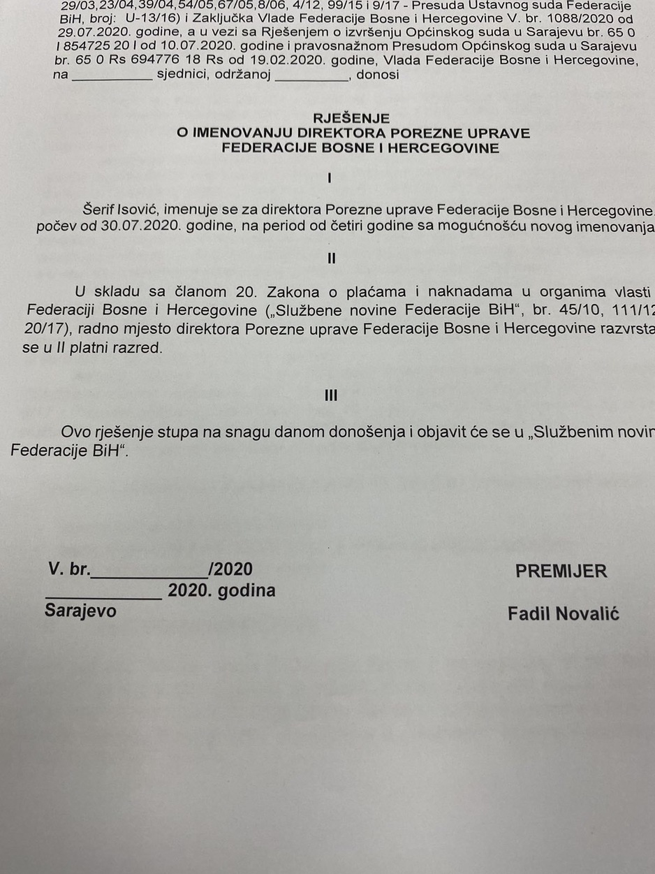 Šerif Isović konačno imenovan za direktora Porezne uprave Federacije BiH