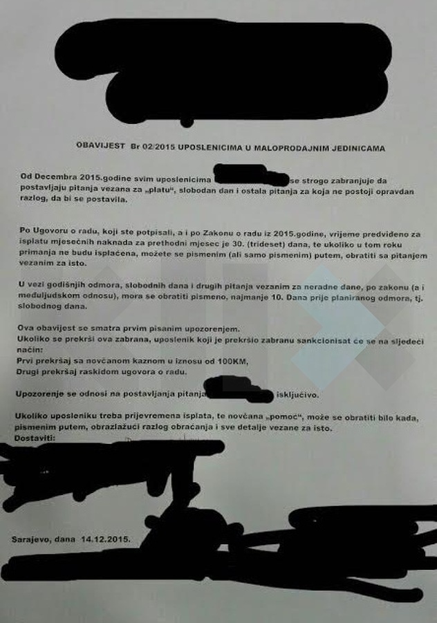 Ukoliko neko od radnika prekrši odredbu, tj. ukoliko se poslodavcu obrati pitanjem u vezi s platom u okviru 30-dnevnog roka za isplatu, bit će kažnjen odbijanjem od plate u iznosu od 100 konvertibilnih maraka.