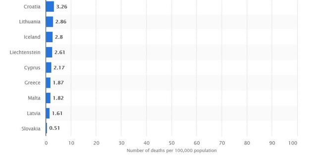 Bosna i Hercegovina je tako prema podacima agencije Statista od 26. jula u rangu s Austrijom, Mađarskom i Finskom, odnosno zemljama koje imaju između 6 i 10 smrtnih slučajeva na 100.000 stanovnika. Zanimljivo je da BiH ima manju stopu od Njemačke i Danske.