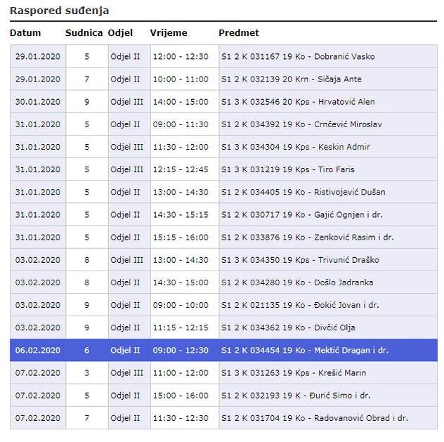 Ovaj proces vodi sutkinja Dalida Burzić, a u rasporedu suđenja u Sudu Bosne i Hercegovine navedeno je da će ročište o određivanju mjera zabrane bit održano u periodu od 9:00 do 12:30 sati.