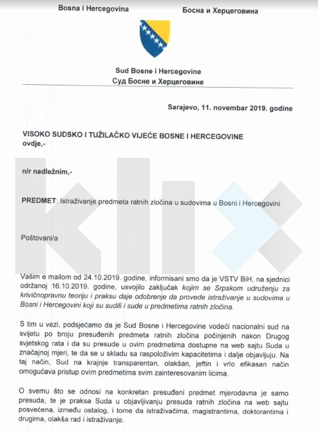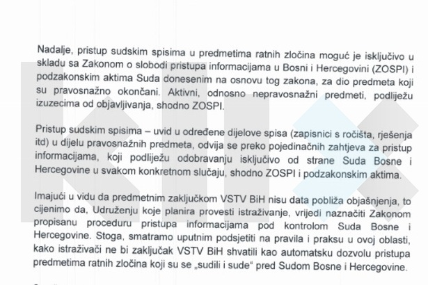 "Aktivni, odnosno nepravosnažni predmeti, podliježu izuzecima od objavljivanja, shodno ZOSPI-ju. Pristup sudskim spisima - uvid u odredene dijelove spisa (zapisnici s ročišta, rješenja itd) u dijelu pravosnažnih predmeta, odvija se preko pojedinačnih zahtjeva za pristup informacijama, koji podliježu odobravanju iskljucivo Suda Bosne i Hercegovine u svakom konkretnom slučaju, shodno ZOSPI i podzakonskim aktima. lmajući u vidu da predmetnim zaključkom VSTV-a nisu data pobliža objašnjenja, to cijenimo da udruženju koje planira provesti istraživanje, vrijedi naznačiti Zakonom propisanu proceduru pristupa informacijama pod kontrolom Suda Bosne i Hercegovine. Stoga, smatramo uputnim podsjetiti na pravila i praksu u ovoj oblasti, kako istraživači ne bi zaključak VSTV shvatili kao automatsku dozvolu pristupa predmetima ratnih zločina koji su se "sudili isude" pred Sudom Bosne i Hercegovine", jasan je stav Suda BiH.