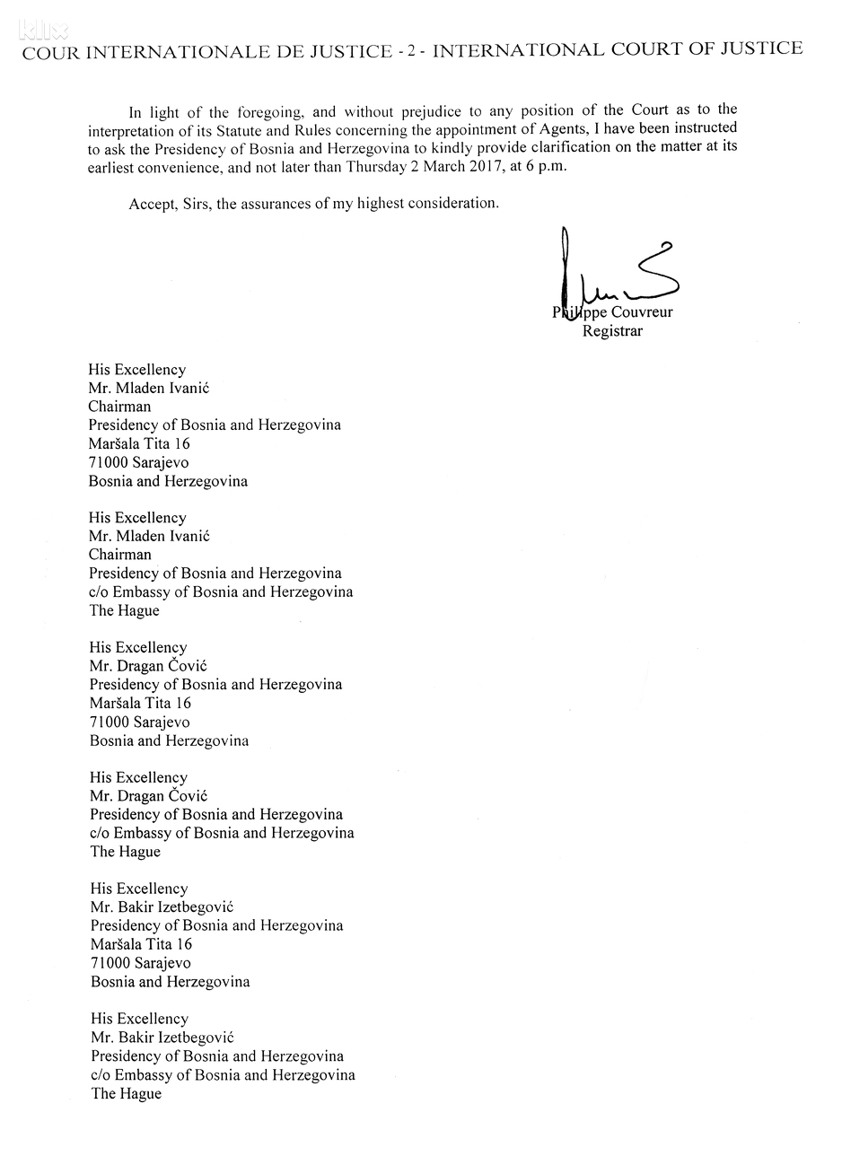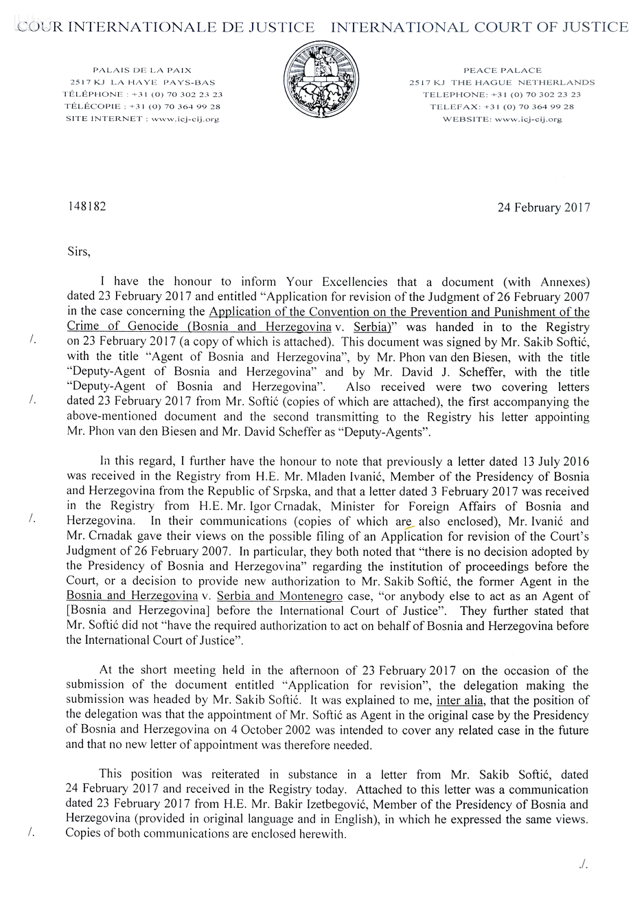 Suština pisma upućenog na adresu trojice članova Predsjedništva je pojašnjenje statusa Sakiba Softića, zbog konfuzije koja je nastala nakon što je u julu prošle godine Mladen Ivanić pisao sudu u Hagu i osporavao legitimitet Softića da zastupa BiH u postupku revizije presude.