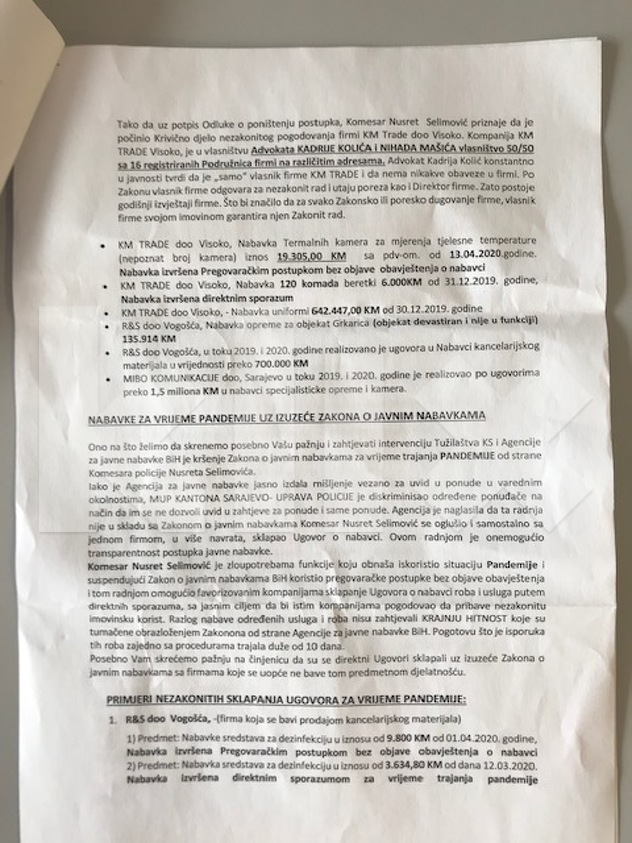 Dalje skreću pažnju na navodno kršenje Zakona o javnim nabavkama za vrijeme trajanja pandemije te se navode primjer 'nezakonitih sklapanja ugovora za vrijeme pandemije'. Povodom ove prijave kontaktirali smo i komesara Selimovića, ali on nije odgovarao na poziv.