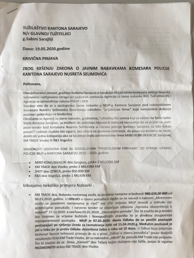 "Obraćamo se Agenciji za javne nabavke, Tužilaštvu KS i onima koji se nalaze na funkcijama Vlade KS sa molbom da pokušaju nagovoriti neku od kompanija da se prijavi na javni poziv-tender kod komesara Nusreta Selimovića u Upravi policije KS za bilo kakav posao. Odmah možete biti sigurni, bez obzira na poslovne reference, da posao na tenderu ne može dobiti niti jedna kompanija ako za taj posao budu zainteresirane određene četiri firme", navodi se, između ostalog, u prijavi.