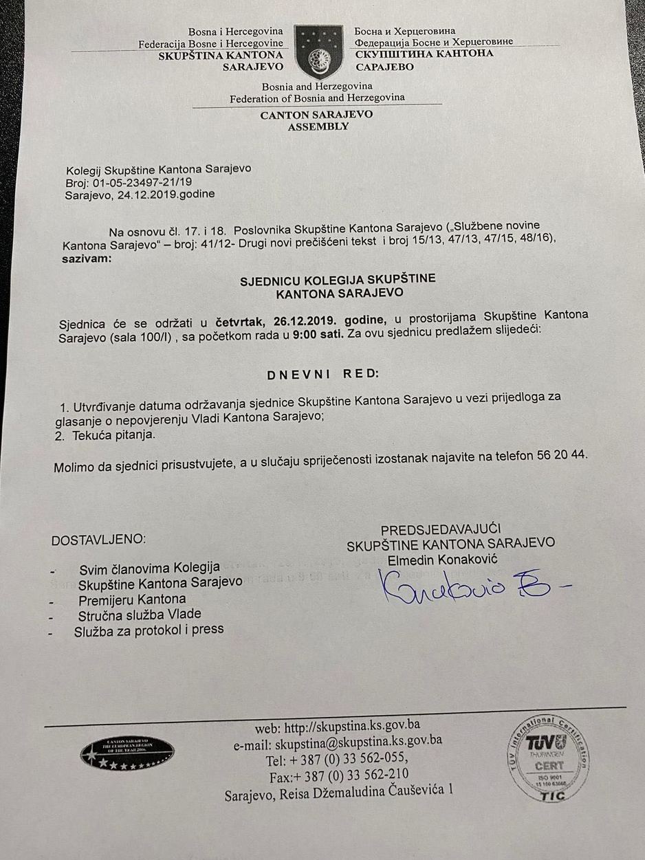 Sjednica Kolegija će se održati u 9 sati i tada bi trebao biti poznat datum sjednice Skupštine Kantona o nepovjerenju Vladi.
