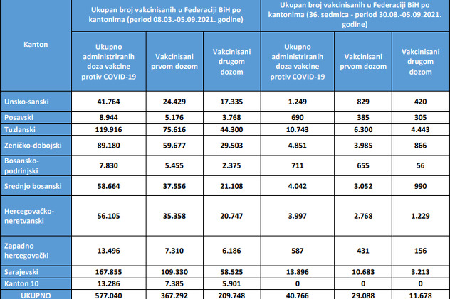 Najmanje vakcinisanih je u Posavskom kantonu - 4.073 potpuno vakcinisanih i u Bosanskopodrinjskom kantonu - 2.431 potpuno vakcinisan građanin. Prvu dozu u Posavskom kantonu primio je 5.561 građanin, dok u BPK taj broj iznosi 6.110.