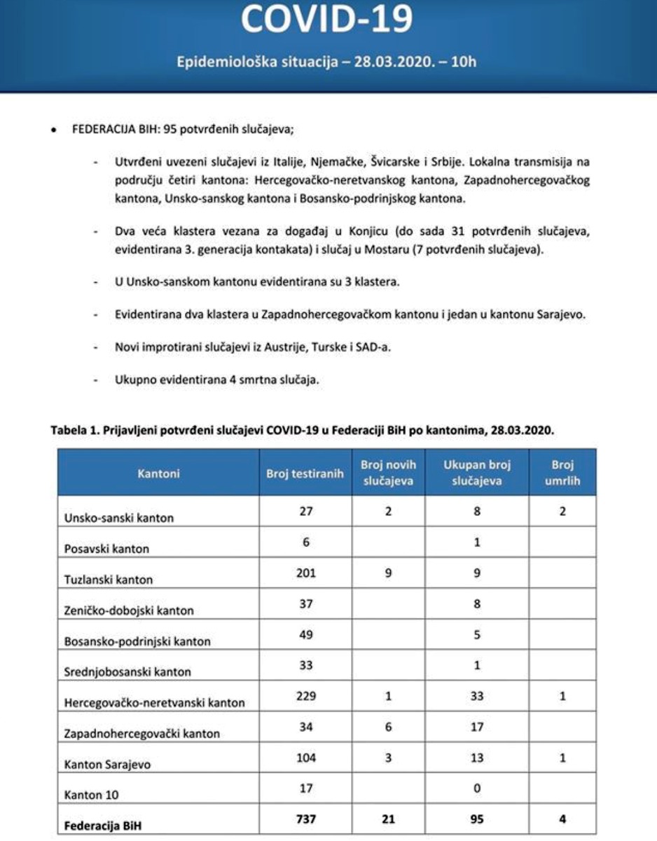 U saopćenju Zavoda za javno zdravstvo Federacije BiH se navode podaci prikupljeni danas do 10 sati, prema kojim potvrđeno 95 novih slučajeva zaraze koronavirusom te da su uvezeni slučajevi iz Italije, Njemačke, Švicarske i Srbije. Lokalna transmisija je registrovana na području četiri kantona, a to su Hercegovačko-neretvanski, Zapadno-hercegovači, Unsko-sanski i Bosansko-podrinjski kanton.