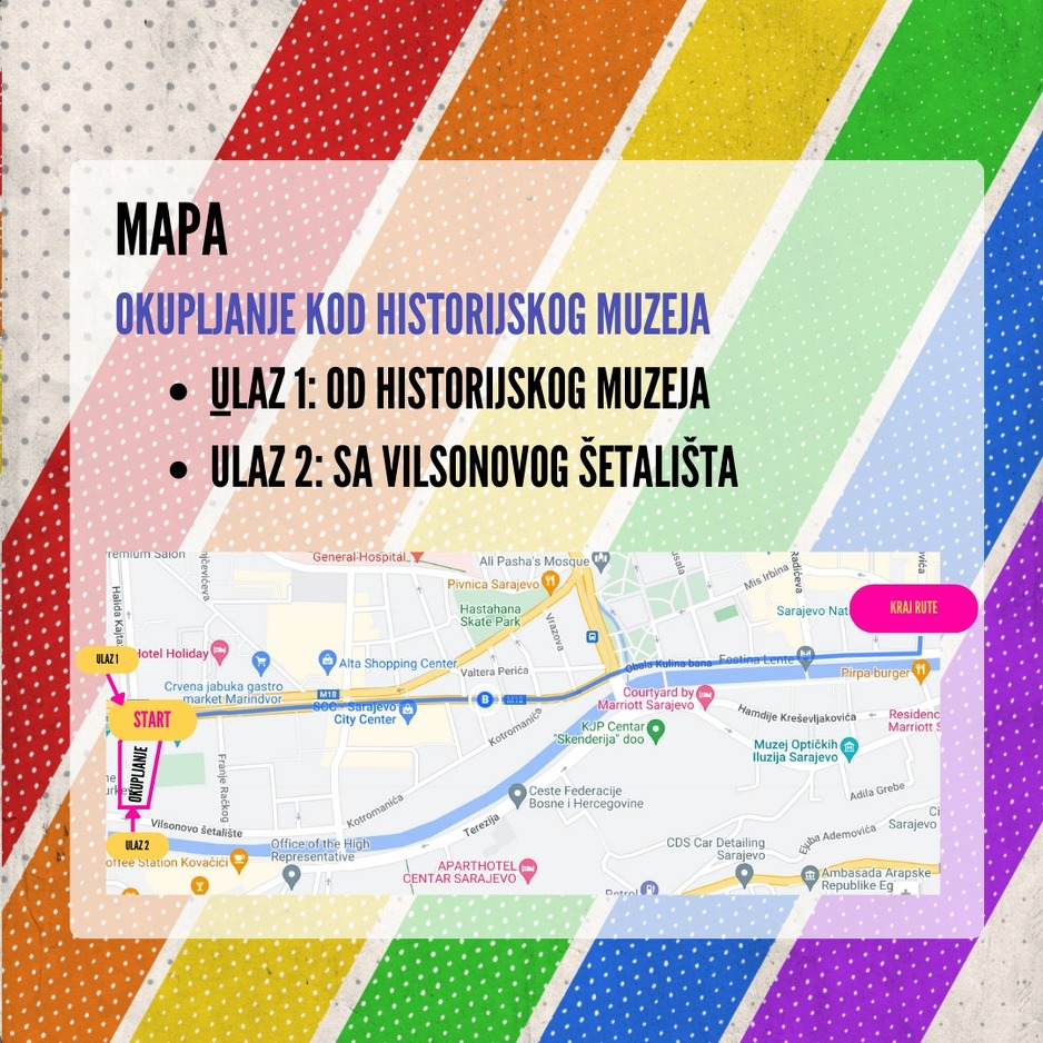 Šetnja pripadnika LGBT zajednice, aktivista i građana će krenuti u 18:00 sati ulicama Zmaja od Bosne - Hiseta - Obala Kulina bana - Kulovića te završava ispred Narodnog pozorišta na Trgu Susan Sontag.