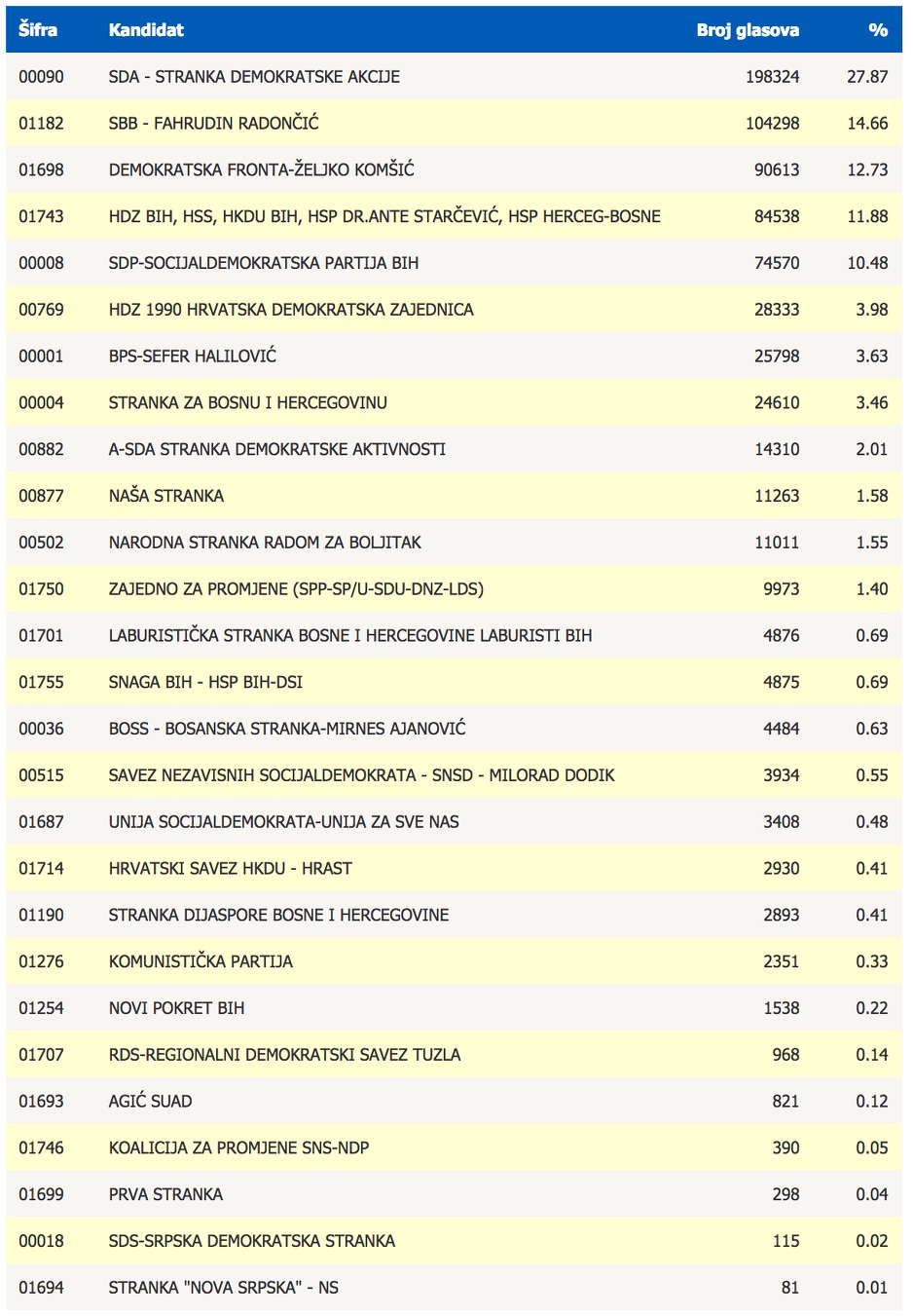 Demokratska fronta osvojila je 90.613 glasova (12,73), Koalicija HDZ BiH, HSS, HKDU BiH, HSP "Dr Ante Starčević" i HSP Herceg-Bosne dobila je 84.538 glasova (11,88), a SDP BiH 74.570 glasova (10,48).