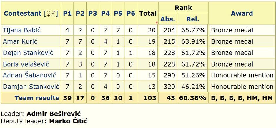 "U konkurenciji 107 zemalja ekipno smo osvojili 43. mjesto. Ovo je već treća godina zaredom da BiH osvaja 4 medalje, što nam je uspjelo samo još 2000. godine. Također, prvi put je ekipa BiH imala trocifren broj bodova, ukupno 103 (dosadašnji rekord je bio 97)", poručili su naši takmičari.