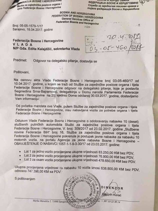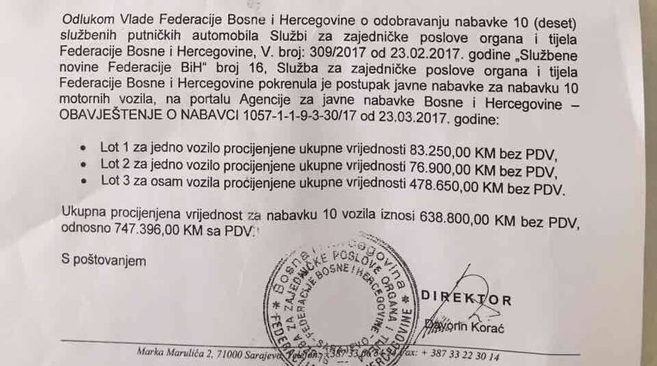 Tačnije, riječ je o postupku kojeg je Vlada Federacije BiH pokrenula prije više od dva mjeeca, odnosno 23. februara 2017., a kroz odobravanje nabavke deset službenih putničkih automobila Službi za zajedničke poslove organa i tijela FBiH.