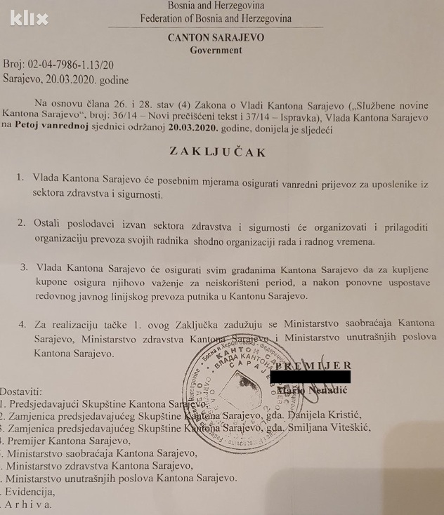 "Ministarstvo zdravstva i MUP KS dostavit će Ministarstvu saobraćaja spiskove uposlenih. Informacije o lokacijama i terminima u kojima će prijevoznici preuzimati putnike u općinama KS, te ih prevoziti do radnih mjesta bit će poznate i objavljene do kraja ovog dana na web i facebook stranici Vlade, a bit će dostavljene i medijima", naveli su iz Vlade KS.