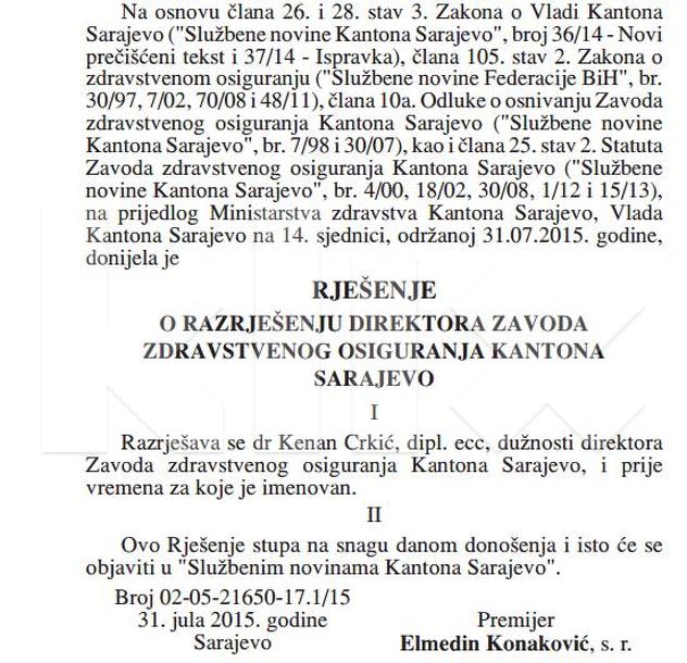 Konačno, premijer Vlade KS Elmedin Konaković potpisao je 31. jula 2015. Rješenje o razrješenju direktora Zavoda zdravstvenog osiguranja Kantona Sarajevo.
