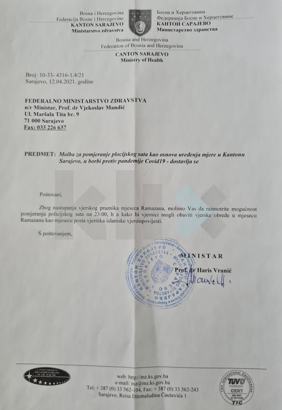 Ovaj prijedlog dio je ublažavanja mjera koje su u Kantonu Sarajevo donesene zbog ublažavanja širenja trećeg vala pandemije, a koje su očito dale rezultata.