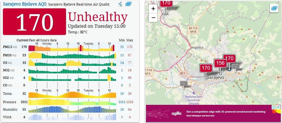 Indeks kvaliteta zraka za Kanton Sarajevo je 159, a na području općina Novi Grad i Stari Grad iznosi 170. Koncentracija čestica PM10 iznosi 75. Isti indeks zagađenja izmjeren je i na području Ilijaša, ali je zabilježena veća koncentracija štetnih čestica.