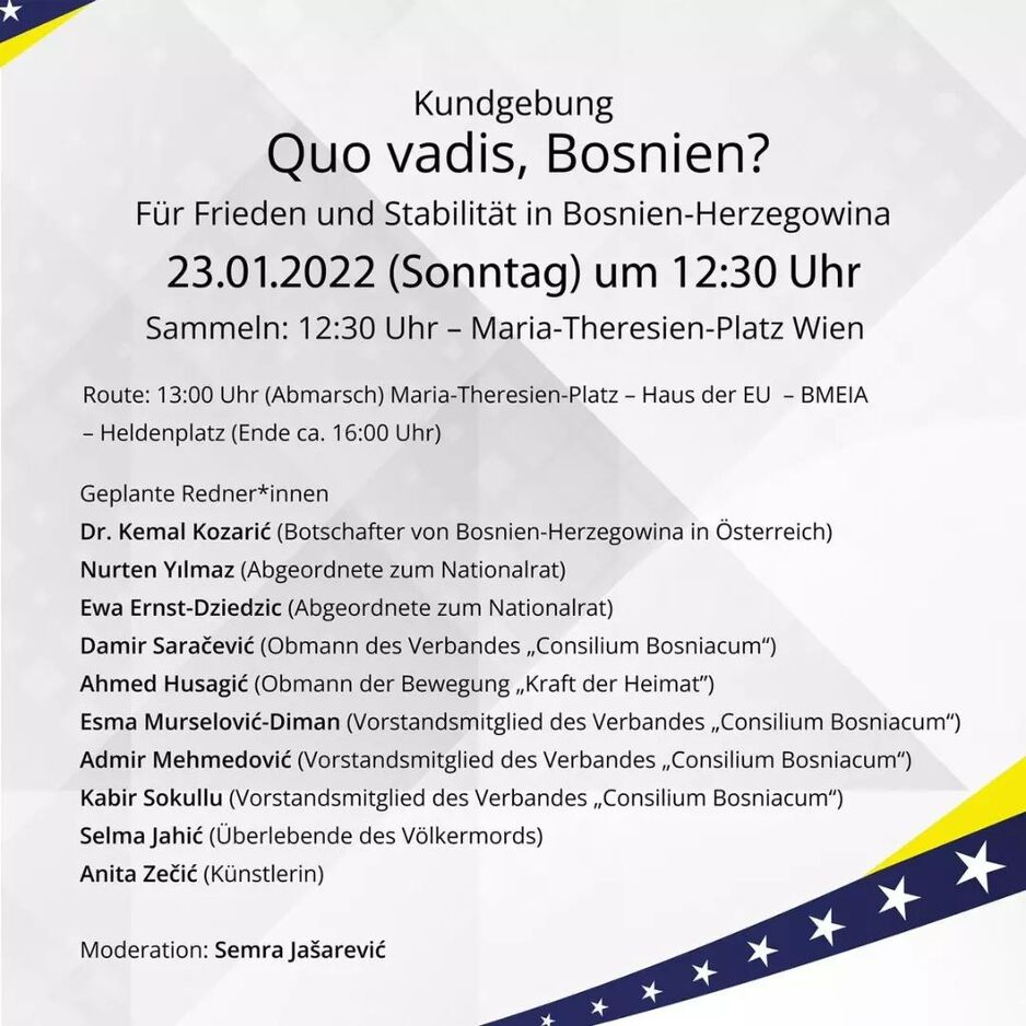 Riječ je o protestu bh. građana okupljenih oko saveza bh. udruženja u Austriji "Consilium Bosniacum". Oni danas u 12:30 sati na Maria-Theresien-Platz organizuju mirne proteste "za mir i stabilnost Bosne i Hercegovine", a pod istim motom kao i jučerašnji protesti u Stuttgartu - "Quo vadis, Bosna".