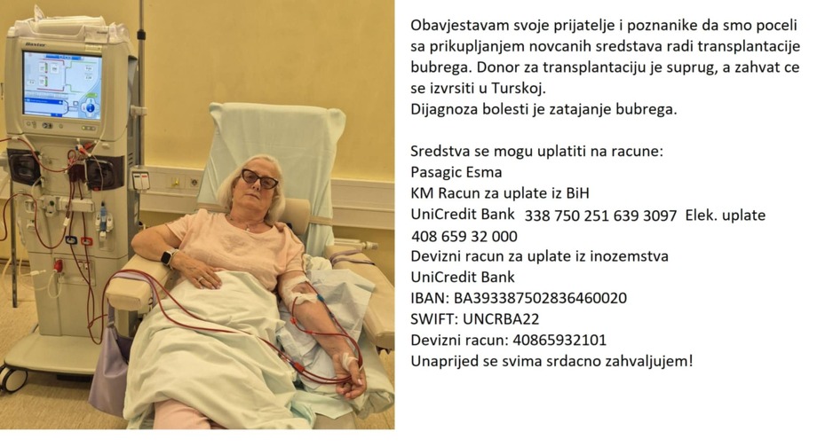 Esma Pašagić zbog zatajenja bubrega hitno mora na transplataciju u Tursku, zbog čega je pokrenut apel za prikupljanje novčane pomoći.