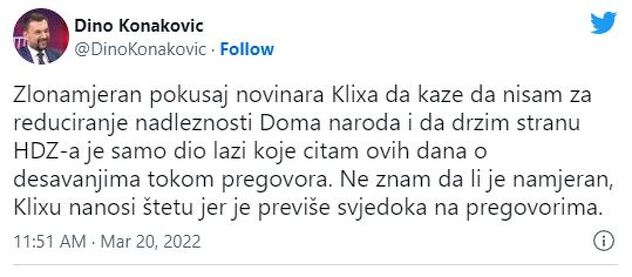 Nakon niza negativnih reakcija na njegov račun zbog ove rečenice, Konaković je "krivca" pronašao u portalu Klix.ba jer mu se nimalo nije dopalo kako smo tada, u momentima pregovora o izmjenama Izbornog zakona BiH, precizno prenijeli njegovu izjavu sa Twittera uz opasku da je indikativan trenutak objave s obzirom da je on, kao jedan od pregovarača, objelodanio nešto što suštinski ide u prilog HDZ-u s obzirom da ta stranka nije željela pristati na suštinsko reduciranje Doma naroda Federacije BiH.
