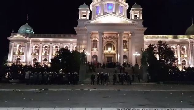 Oko 23:20 dogodio najsilovitiji pokušaj upada u zgradu Skupštine. Tada su policajci gađani kamenicama i drugim predmetima, a stigao je odgovor pendrecima i suzavcima. Ranije je tokom noći bilo nekoliko pokušaja koji su osujećeni.