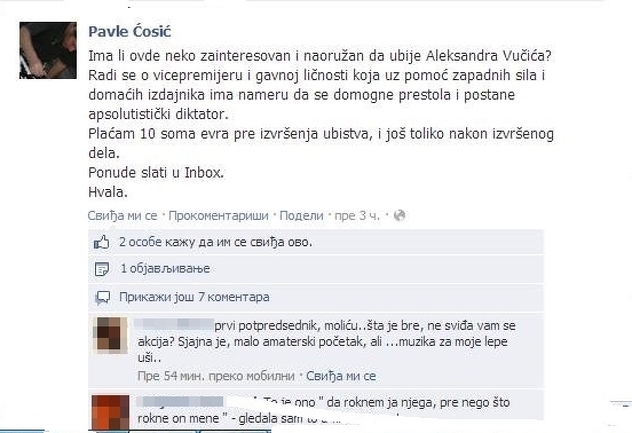 Blic je objavio da je beogradska policija uhapsila Pavla Ćosića, novinara Pečata, jer je juče na svom nalogu na Facebooku napisao da će platiti ako neko ubije Aleksandra Vučića, prvog potpredsjednika Vlade Srbije.