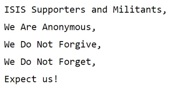 "Podržavaoci i borci IDIL-a. Mi smo Anonymousi. Mi ne opraštamo, mi ne zaboravljamo. Očekujte nas", stoji u poruci napisanoj iznad spiska.