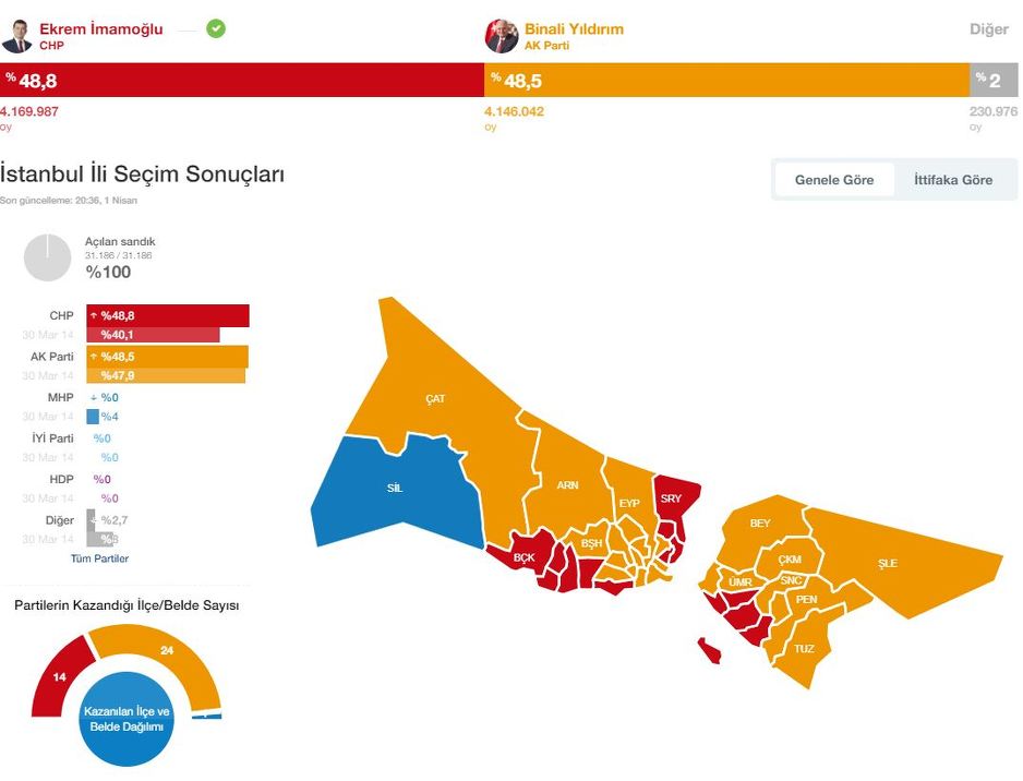 Nakon 100 posto prebrojanih glasova tijesnu pobjedu je odnio Ekrem Imamoglu iz Republikanske narodne stranke sa 48,79 posto glasova, dok je Binali Yildirim (AKP) osvojio 48,51 posto.