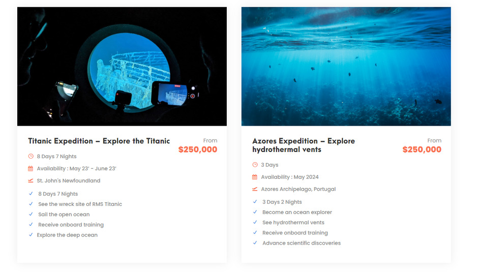 "Svaka ekspedicija košta 250.000 dolara po osobi, nudi jedno ronjenje pod vodom, privatni smještaj, neophodnu obuku i ekspedicijsku opremu. Maksimalni kapacitet podmornice ograničen je na šest osoba", navodi se.