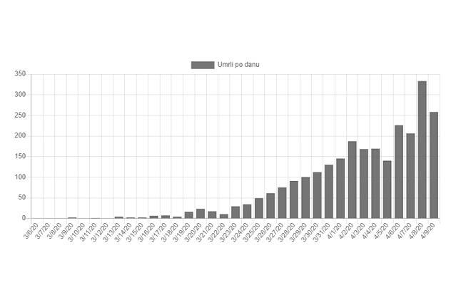 Ovo je, ipak, znatno manje umrlih usljed zaraze koronavirusom nego jučer kada je zabilježeno njih 333. Ukupno je do sada umrlo 2.607 osoba od posljedica zaraze koronavirusom.