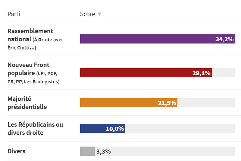 Prema procjeni Ipsosa, kao i francuskih televizija, u prvom krugu izbora desničarska stranka Nacionalno okupljanje koju predvodi Jordan Bardella osvojila je 34 posto glasova.