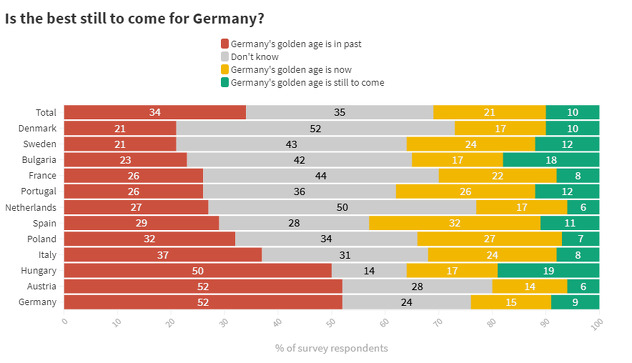 S druge strane, 21 posto ispitanika smatra kako doba Angele Merkel predstavlja vrhunac njemačkog prosperiteta te da Njemačka sada živi svoje zlatno doba. Samo 10 posto od anketiranih Evropljana smatra kako Njemačku čeka bolja budućnost nakon dolaska novog njemačkog kancelara ili kancelarke.