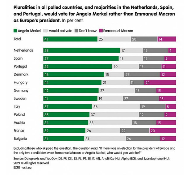Ono što je zanimljivo jeste da bi većina Evropljana koja vjeruje da je "zlatno doba" Njemačke prošlost isto tako izabrali Angelu Merkel za "predsjednicu Evrope" u odnosu na Emmanuela Macrona.