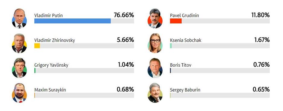 Prema podacima ruske centralne izborne komisije, a nakon 99,84 posto prebrojanih glasova, Vladimir Putin je uvjerljivo na prvom mjestu među kandidatima sa 76,6 posto osvojenih glasova.